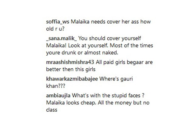 इसी तस्वीर पर मलाइका को ट्रोल करते हुए कुछ लोग लिख रहे हैं कि आपको थोड़े ढंग के कपड़े पहनने चाहिए। लोग लिख रहे हैं कि मलाइका को अपनी उम्र देखते हुए खुद को ढक कर रखना चाहिए। वहीं कुछ लोग लिख रहे हैं कि मलाइका अपनी ज्यादातर तस्वीरों में या तो नशे में दिखती हैं या फिर नंगी। मलाइका को चीप बताते हुए उनका कोई क्लास ना होने जैसी बातें भी कही जा रही हैं।
