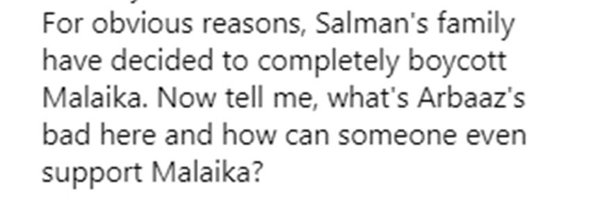एक यूजर ने लिखा- अर्जुन सही खेल गया। वहीं एक अन्य यूजर ने लिखा कि अर्जुन कहां है, क्या वह तुम्हारी टीम का हिस्सा नहीं है। वहीं एक यूजर ने मलाइका पर पैसों के लिए अर्जुन से रिश्ता जोड़ने का आरोप लगाया। यूजर ने लिखा कि सलमान के परिवार ने मलाइका को पूरी तरह से बॉयकाट करने का फैसला लिया है। बताओ कोई कैसे मलाइका का सपोर्ट कर सकता है? एक यूजर लिखता है- दीदी आपका छोटा बेटा अर्जुन कहां है?