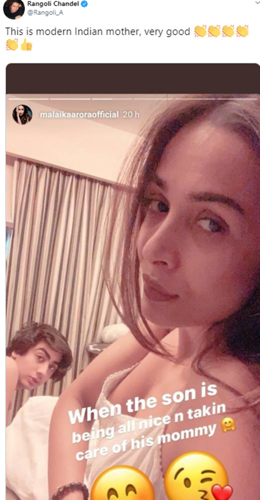 रंगोली ने इस तस्वीर को शेयर किया जिसमें मलाइका नाइटी पहन करवट लिए लेटी हैं। पैरों की तरफ मलाइका के बेटे अरहान हैं। मलाइका ने अपनी इस तस्वीर के ऊपर लिखा था- जब बेटा मां के लिए प्यार उड़ेले और मां की देखभाल करे।’ मलाइका की इस तस्वीर से ऐसा लगता है कि अरहान मलाइका के पैर दबा रहे हैं।