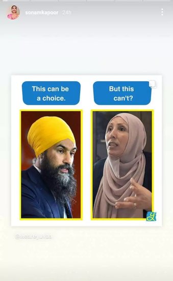 सोनम कपूर ने मामले पर रिएक्शन देते हुए पोस्ट किया था जिसमें दो तस्वीरें पोस्ट की थीं। एक तस्वीर में पगड़ी पहने एक सिख दिखाई दे रहा था तो दूसरी में हिजाब पहने मुस्लिम महिला। तस्वीर शेयर करते हुए सोनम ने सिख की तस्वीर पर लिखा, ये हो सकता और मुस्लिम वाली पर लिखा ये नहीं हो सकता।