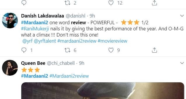 रानी मुखर्जी की फिल्म को हर कोई 3 स्टार्स से नीचे दे ही नहीं रहा। यानी फिल्म दर्शकों को पसंद आ रही है। लोग फिल्म को वन वर्ड रिव्यू देते हुए कह रहे हैं पावरफुल। रानी की परफॉर्मेंस के लिए उन्हें काफी तारीफें मिल रही हैं। रानीके लिए कहा जा रहा है कि ये साल की बेस्ट परफॉर्मेंस है। फिल्म का क्लाइमेक्स जबरदस्त बताया जा रहा है।