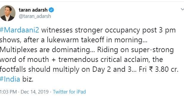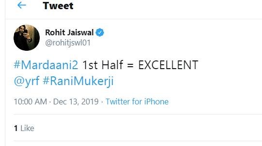 हर ओर से रानी मुखर्जी की फिल्म को तारीफें मिल रही हैं। फैंस कह रहे हैं कि रानी की डायलॉग डिलिवरी और उनका अंदाज बहुत धांसू लग रहा है फिल्म में। ट्रेड एनेलिस्ट रोहित जैसवाल के मुताबिक रानी मुखर्जी की फिल्म का पहला भाग बेहद शानदार है। उन्होंने रानी की मर्दानी 2 का फर्स्ट हाफ एक्सिलेंट बताया है।