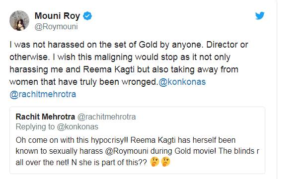 इन दिनों पूरे देश में मीटू कैंपेन को लेकर चर्चा हो रही है। बॉलीवुड के अलावा अन्य सेक्टर की महिलाएं भी अपने साथ हुए यौन शोषण की दास्तां को इस कैंपेन के जरिए शेयर कर रही हैं। वहीं एक ट्विटर यूजर ने डायरेक्टर रीमा कागती पर फिल्म ‘गोल्ड’ के दौरान मौनी रॉय को हैरेस करने की बात कही है। जिसके बाद मौनी ने ट्विटर यूजर को करारा जवाब दिया है।