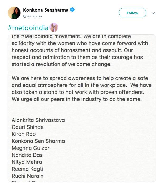 दरअसल कोंकणा सेन शर्मा ने एक ट्विटर पोस्ट के जरिए जानकारी दी है कि भारतीय सिनेमा की 11 महिला फिल्ममेकर ने मिलकर तय किया है जिस शख्स पर हैरेसमेंट के आरोप सिद्ध होते हैं, भविष्य में यह लोग उसके साथ काम नहीं करेगी। जिसमें रीमा कागती का नाम भी शामिल है। कोंकणा के इस ट्वीट का जवाब देते हुए एक ट्विटर यूजर ने लिखा- ”ओह अब बहुत हुआ पाखंड, रीमा कागती को कि खुद फिल्म ‘गोल्ड’ के दौरान मौनी रॉय को हैरेस करने के लिए जानी जाती हैं। क्या सभी लोग अंधे हैं? और वह इसका हिस्सा है??”
