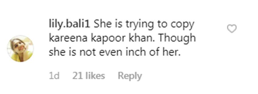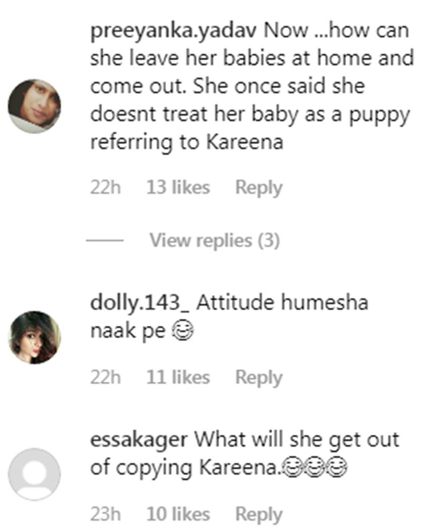 एक यूजर ने लिखा- यह करीना की नकल करने की कोशिश कर रही है। लेकिन यह उसकी तरह एक इंच भी नहीं है। वहीं एक अन्य यूजर ने लिखा- यह कैसे अपने बच्चों को घर पर अकेले छोड़ सकती है। जबकि एक बार उन्होंने बोला था कि यह अपने बच्चों के साथ करीना की तरह पप्पी जैसा बर्ताव नहीं करती हैं। वहीं एक अन्य यूजर लिखता है- एटीट्यूड हमेशा नाक पर रहता है।