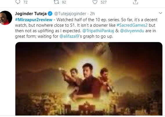 इधर, ट्रेड एनेलिस्ट जुगेंद्र टुटेजा ने अपने मिर्जापुर 2 रिव्यू में कहा है कि उन्होंने 10 एपिसोड देखे हैं सीरीज के। उन्हें ये पार्ट पसंद आया है। लेकिन इस बात से वह भी सहमत हैं कि सीजन 1 के आसपास भी नहीं भटकता सीजन 2। उनके मुताबिक -'मैंने जितना एक्सपेक्ट किया था उसस ग्राफ का लेवल हाई था।'