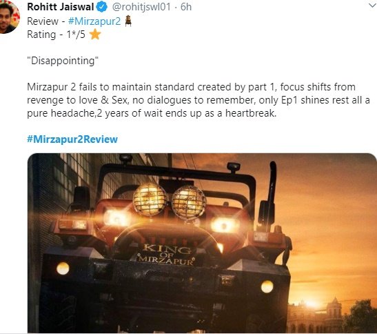 रोहित जैसवाल के मुताबिक- मिर्जापुर 2 वो जादू नहीं बिखेर पाई है जो पहले सीजन में देखने को मिला था। उन्होंने कहा- बदले से फोकस शिफ्ट करके लव और सेक्स की तरफ पेश किया गया है। एक डायलॉग ऐसा नहीं जो जहन में रह जाए। 2 साल का इंतजार ऐसे खत्म हुआ।