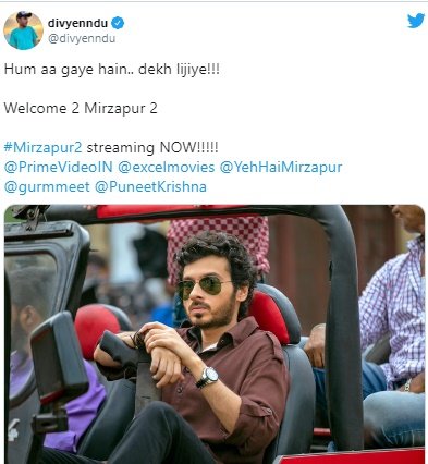 दिव्येंदु शर्मा का पोस्ट सामने आया है जिसमें वह लिखते हैं- हम आ गए हैं..देख लीजिए। वेलकम टु मिर्जापुर 2। इस सीरीज में दिव्येंदु शर्मा बहुत ही खतरनाक अवतार में नजर आ रहे हैं। पहली सीरीज में तो वह खून की होली खेलते दिखे ही थे। पर इस बार उनका औधा सीरीज में और ऊंचा हो गया है ऐसे में वह कत्ल-ए-आम मचा रहे हैं।