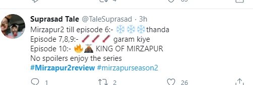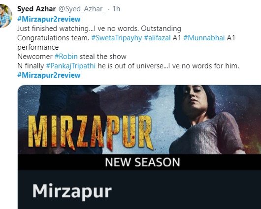 मिर्जापुर सीरीज को काफी पसंद किया जा रहा है। एक फैन ने ट्वीट कर बताया- अभी अभी खत्म की है सीरीज, मेरे पास शब्द नहीं हैं आउटस्टैंडिंग। कॉन्ग्रेचुलेशन्स टीम श्वेता त्रिपाठी, पंकज त्रिपाठी, अली फजल एवन सीरीज और एक्टिंग। न्यूकमर रॉबिन ने शो में जान डालदी। पंकज त्रिपाठी आप तो पूरा जहां हैं। मजा आ गया।'