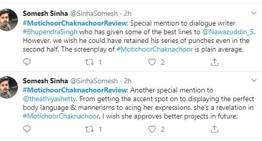 आथिया शेट्टी और नवाजुद्धीन की फिल्म को मिली जुली प्रतिक्रिया मिल रही है। वहीं फिल्म को 2 से 2.5 स्टार्स मिल रहे हैं।