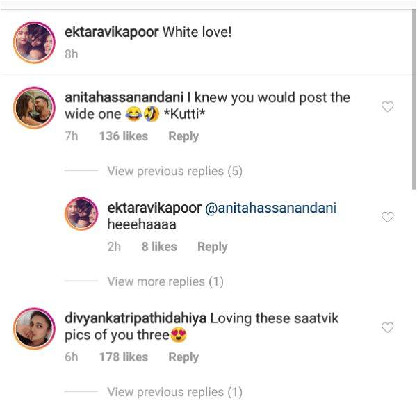 एकता कपूर ने अनीता के कमेंट का जवाब देते हुए लिखा- हाहाहा। एकता और अनीता की बातचीत के दौरान ही दिव्यांका त्रिपाठी दाहिया ने भी लिखा- आप तीनों की यह सात्विक तस्वीर बहुत प्यारी है।
