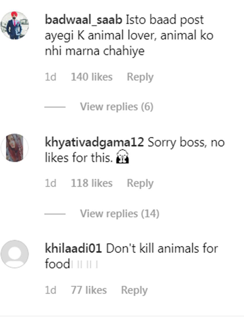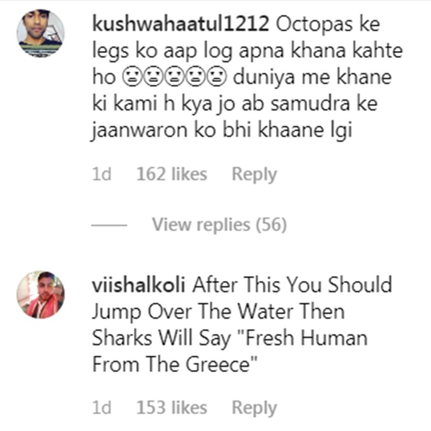 एक सोशल मीडिया यूजर लिखते हैं- ऑक्टोपस की टांगों को आप लोग अपना खाना कहते हैं। दुनिया में खाने की कमी है क्या, जो अब समुद्र के जीवों को भी खाने लगी हैं। वहीं एक अन्य यूजर लिखते हैं- इसके बाद आपको समुद्र पर छलांग लगा देनी चाहिए, जिसके बाद शार्क कहेगी- ग्रीस में फ्रेश ह्यूमन। वहीं एक यूजर लिखते हैं- इसके बाद पोस्ट आएगी कि एनिमल लवर, जानवरों को नहीं मारना चाहिए। एक इंस्टा यूजर लिखते हैं- फूड के लिए जानवरों को मत मारो। इसके अलावा भी कई इंस्टा यूजर्स ने इस पोस्ट को लेकर अपनी नाराजगी जाहिर की है।