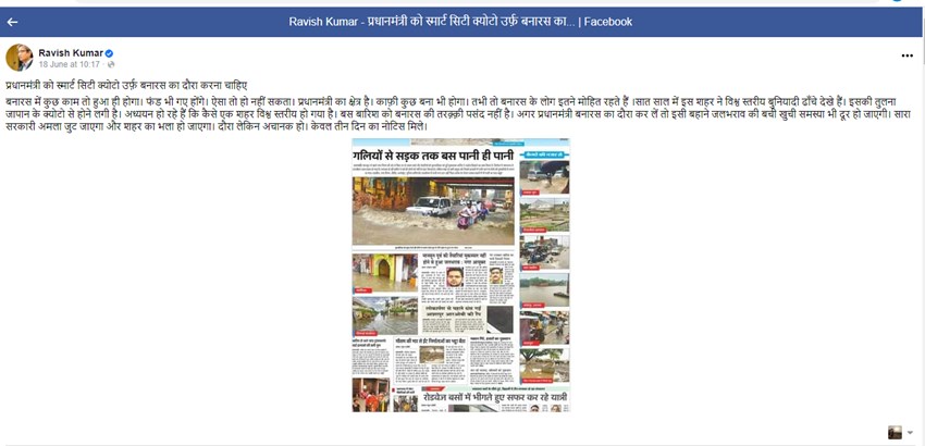 प्रधानमंत्री नरेंद्र मोदी के संसदीय क्षेत्र वाराणसी के तमाम इलाकों में बरसात के बाद जलभराव हो गया। इस वजह से लोगों को तमाम मुश्किलों का सामना करना पड़ा। जलभराव की तस्वीरें सोशल मीडिया पर भी वायरल हो रही हैं। इसी बीच वरिष्ठ पत्रकार रवीश कुमार ने वाराणसी में जलभराव की कुछ तस्वीरें और न्यूज़ क्लिपिंग साझा कर प्रधानमंत्री नरेंद्र मोदी को ताना मारा है। उन्होंने अपने फेसबुक पेज पर लिखा कि प्रधानमंत्री को स्मार्ट सिटी क्योटो उर्फ बनारस का दौरा करना चाहिए।