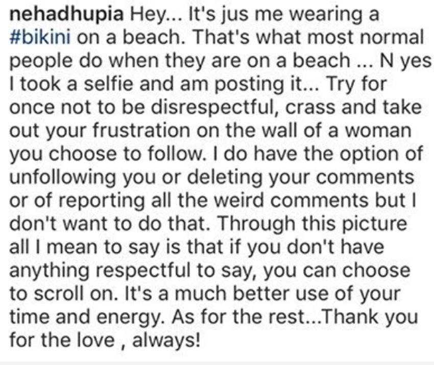 यह पहला मौका नहीं है जब नेहा ने ट्रोल्स की क्लास लगाई है। इसके पहले भी नेहा ने एक बिकिनी फोटो शेयर करते हुए कैप्शन लिखा, ”हां, मैंने बीच में बिकिनी पहनी हुई है, जैसा की नॉर्मल लोग बीच में करते हैं और हां मैंने बीच में सेल्फी भी ली है और पोस्ट भी कर रही हूं। एक बार अपमान न करने की कोशिश करिए। अपनी भड़ास निकालने के लिए किसी महिला फॉलो न करें। मेरे पास आप लोगों के द्वारा लिखे गए कमेंट्स को डिलीट करने या अनफॉलो करने का भी विकल्प होता है, लेकिन मैं ऐसा नहीं करना चाहती। मैं यह कहना चाहती हूं कि यदि आप कुछ अच्छा नहीं लिख सकते तो पोस्ट स्कॉल कर सकते हैं। यह आपकी एनर्जी और समय की सही बचत करेगा। शुक्रिया।”