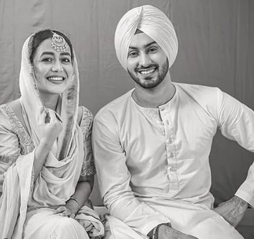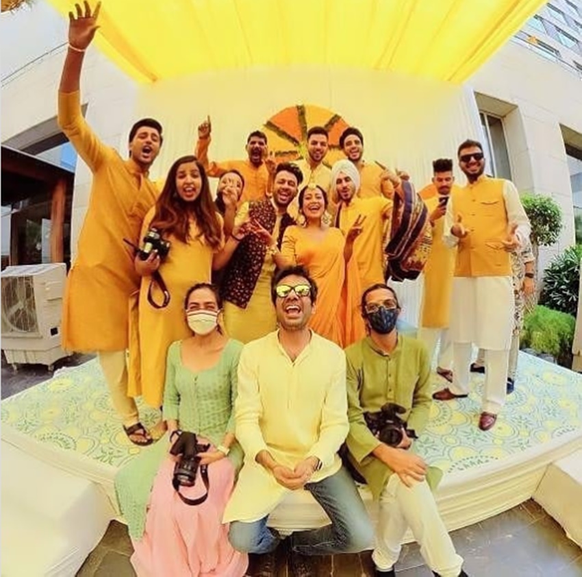 नेहा और रोहनप्रीत अपनी फैमिली के साथ हल्दी रस्म एंजॉय करते हुए।