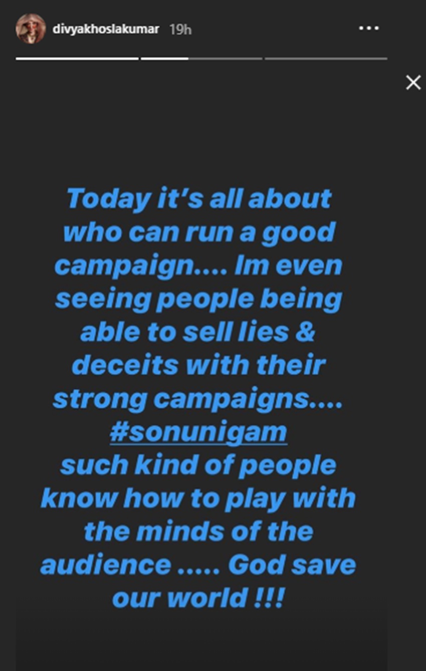 दिव्या ने अपने इंस्टा अकाउंट से दो स्टोरी पोस्ट कीं जिनमें उन्होंने सोनू के लिए काफी कुछ लिखा। दिव्या ने लिखा- ‘आज सब कुछ इस बात पर निर्भर करता है कि कौन कितना अच्छा कैंपेन चला सकता है। मैं तो देख रही हूं कि कई लोग झूठ भी बेचते हैं और अपने कैंपेन को मजबूत करते हैं। सोनू निगम, इस तरह के लोगों में से एक हैं जो जानते हैं कि लोगों के माइंड के साथ खेलना है। भगवान ऐसे लोगों से दुनिया बचाए।’ दिव्या खोसला यहीं नहीं रुकीं।