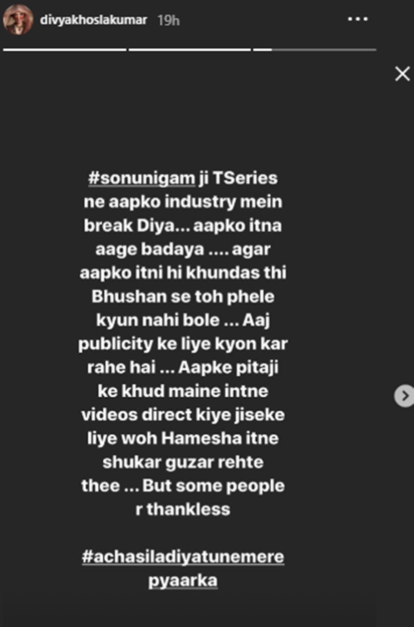 उन्होंने आगे लिखा-‘सोनू निगम जी इंडस्ट्री में टीसीरीज ने आपको ब्रेक दिया। आपको इतना आगे बढ़ाया। अगर आपको इतनी ही खुंदस थी भूषण से तो पहले क्यों नहीं बोला? आज पब्लिसिटी के लिए क्यों कर रहे हो। आपके पिताजी के खुद मैंने कितने वीडियो डायरेक्ट किए, जिसके लिए वह हमेशा इतने शुक्रगुजार रहते थे। लेकिन कुछ लोग अहसान फरामोश होते हैं।’ दिव्या ने आगे हैशटैग के साथ लिखा- अच्छा सिला दिया तूने मेरे प्यार का।