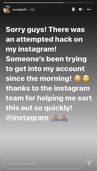 नोरा फतेही ने इंस्टाग्राम स्टोरी लगाते हुए लिखा, “क्षमा करें दोस्तों! मेरे इंस्टाग्राम को हैक करने की कोशिश की गई थी! कोई सुबह से मेरे अकाउंट को हैक करने कि कोशिश कर रहा था! इसे इतनी जल्दी सुलझाने में मेरी मदद करने के लिए इंस्टाग्राम टीम को धन्यवाद!”