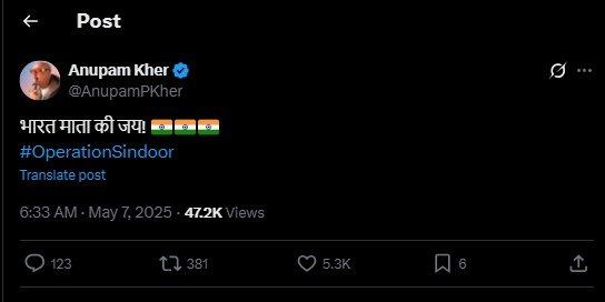 बॉलीवुड एक्टर अनुपम खेर ने भी ऑपरेशन सिंदूर पर पोस्ट किया है। एक्टर ने लिखा है- भारत माता की जय