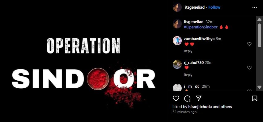 एक्ट्रेस जेनेलिया डिसूजा ने भी ऑपरेशन सिंदूर को लेकर पोस्ट किया है।