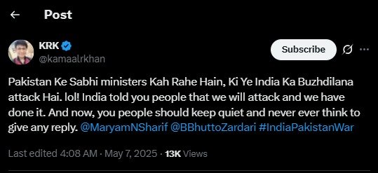 ऑपरेशन सिंदूर पर पोस्ट करते हुए अभिनेता कमाल आर खान ने लिखा, ”पाकिस्तान के सभी मंत्री कह रहे हैं कि ये भारत का बुज़दिलाना हमला है। लोल! भारत ने पहले ही कह दिया था कि हमला करेंगे… और कर दिया। अब चुप रहो और जवाब देने की हिम्मत कभी मत करना।”