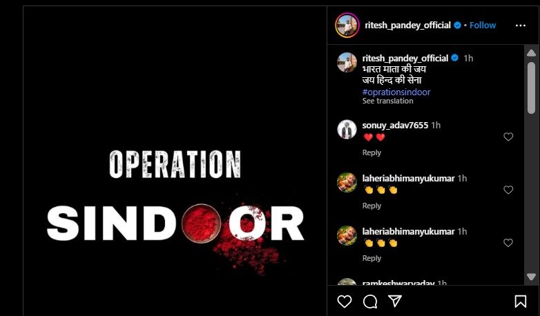वहीं रितेश देशमुख ने पोस्ट करते हुए लिखा है- जय हिंद की सेना, भारत माता की जय