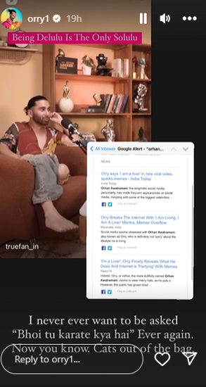 सोशल मीडिया पर एक वीडियो क्लिप वायरल हो रही है जिसमें ओरी बता रहे हैं कि वह क्या करते हैं। वीडियो में ओरी कह रहे हैं, “मैं जी रहा हूं, मैं जीने वाला हूं, मैं यहां जीने के लिए हूं, मैं जी रहा हूं, हां मैं जीने वाला हूं।” इस वीडियो को शेयर करते हुए अब ओरी ने अपनी इंस्टाग्राम स्टोरी पर लिखा है, “मैं नहीं चाहता कोई मुझे दोबारा पूछे ‘भाई तू करता क्या है’।” इस पोस्ट को लेकर सोशल मीडिया पर फिर से हलचल हो गई है। एक यूजर ने लिखा है, “अमीरों के बच्चे लिवर,हम एपेंडिक्स हैं।”