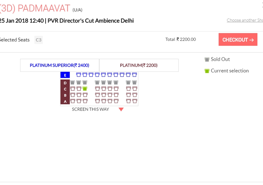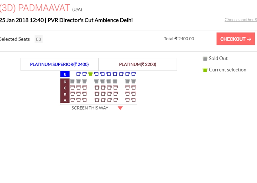 इससे साफ जाहिर होता है कि करणी सेना का डर लोगों को नहीं सता रहा है। वहीं मल्टीप्लेक्स के ओनर्स ने भी इस फिल्म की टिकटों में बढ़ौतरी करने का तय किया है। दिल्ली के मल्टीप्लैक्स PVR: डायरेक्टर्स कट में इस फिल्म की सबसे ज्यादा कीमत की टिकट (प्लैटिनम सुपीरियर) 2400 रूपए है। वहीं फिल्म की (प्लैटिनम) टिकट रेट 2200 रूपए है। आपको बता दें, फिल्म टाइगर जिंदा है और बाहुबली 2 की दो टिकटों को मिला कर पद्मावत की एक टिकट का रेट है।