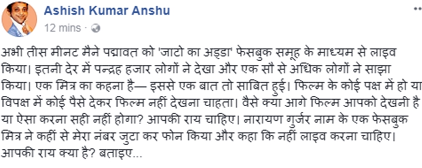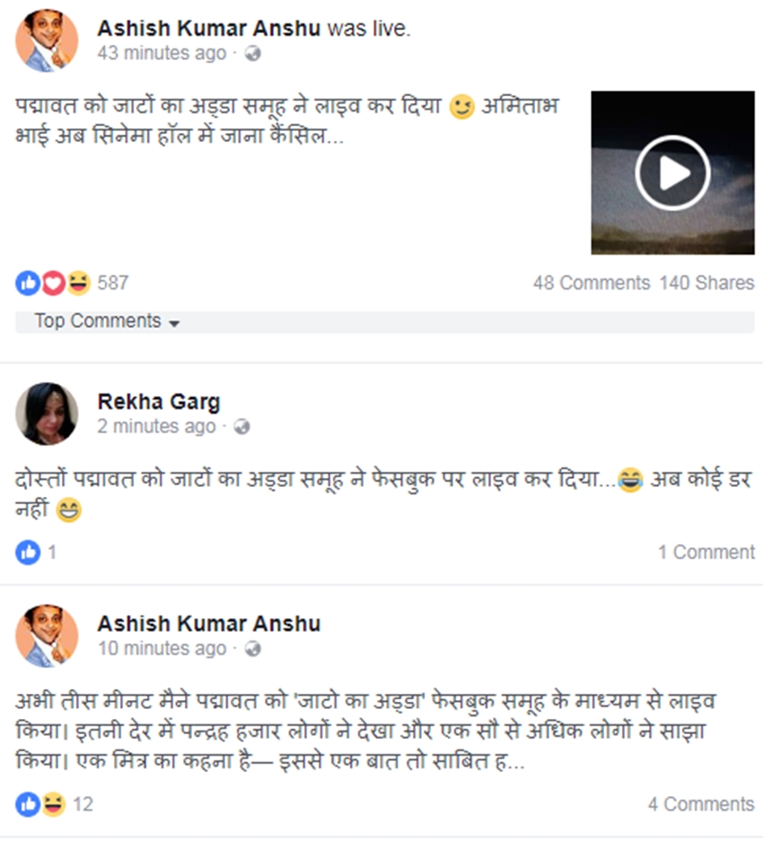 फेसबुक के जरिए किया गया यह लाइव पोस्ट दोस्तों और रिश्तेदारों से होते हुए हजारों लोगों तक पहुंच गया। वीडियो में फिल्म ‘पद्मावत’ का लाइव करीब 25 मिनट से ज्यादा देर तक किया गया है। फेसबुक से यह लाइव एक पेज के द्वारा किया गया। इस पेज का नाम है, ‘जाटों का अड्डा’। वहीं इस लाइव वीडियो को करीब 15,000 लोगों ने अपनी वॉल पर शेयर भी किया। इस वीडियो को देखने वालों की संख्या करीब 3.5 लाख तक पहुंच गई है। इस पोस्ट को शेयर करते हुए किंग ऑफ़ फेसबुक नाम के एक पेज ने लिखा, ‘जिसको पद्मावती लाइव मूवी देखनी हो, जाटों का अड्डा नामक पेज से जुड़ जाएं- लाइव चल रही है या कहो यहीं लाइव मैं भी चला दूं।’