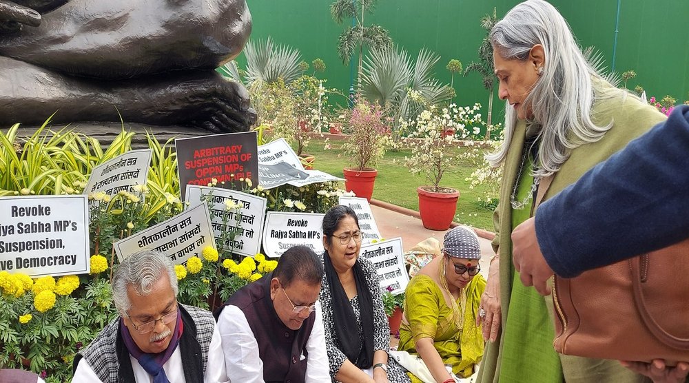 संसद के मौजूदा शीतकालीन सत्र से विपक्षी दलों के 12 सांसदों का निलंबन कर दिया है। संसद के शीतकालीन सत्र के तीसरे दिन बुधवार को भी विपक्षी सांसदों ने जमकर हंगामा किया, जिसके कारण लोकसभा और राज्यसभा, दोनों सदनों की कार्यवाही स्थगित हुई। राज्यसभा में ‘अशोभनीय आचरण’ के लिए निलंबित विपक्षी दलों के 12 सांसद इसी मुद्दे को लेकर संसद परिसर में गांधी प्रतिमा के समक्ष धरना-प्रदर्शन जारी रखे हुए हैं। विपक्ष ने राज्यसभा से 12 सांसदों के निलंबन को बड़ा मुद्दा बनाया हुआ है।