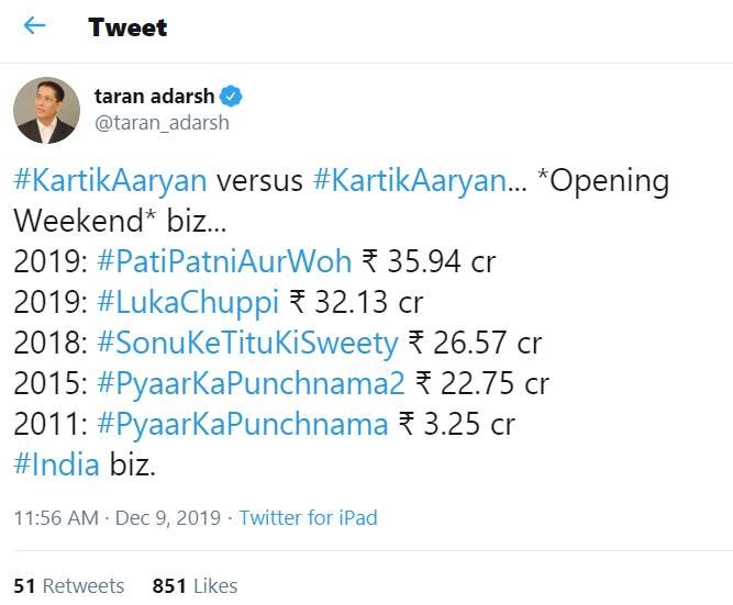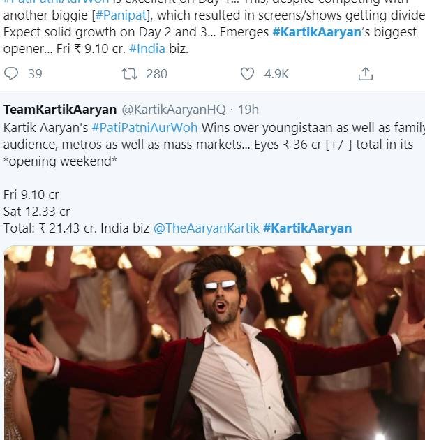 कार्तिक की पति पत्नी और वो ने तोड़ा एक और रिकॉर्ड, ये फिल्म कार्तिक की सबसे बड़ी वीकेंड ओपनर बन गई है।