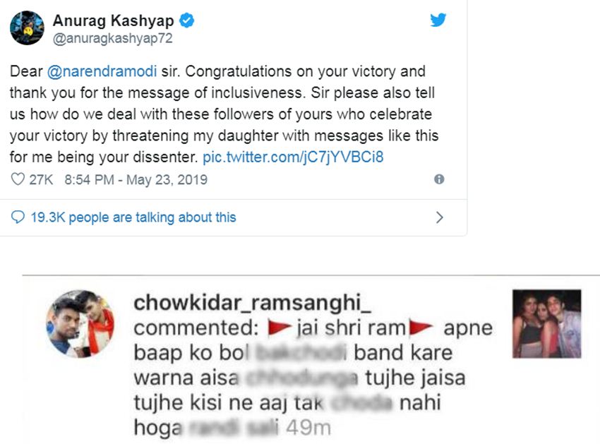 अनुराग ने इसे शेयर करते हुए लिखा था- ”नरेंद्र मोदी सर, जीत के लिए आपको शुभकामनाएं, हमें भी यह बताएं कि आपके उन समर्थकों से कैसे निपटा जाए जो इस जीत का जश्न मेरी बेटी को धमकाते हुए मना रहे हैं, क्योंकि मैं आपका विरोधी हूं?”