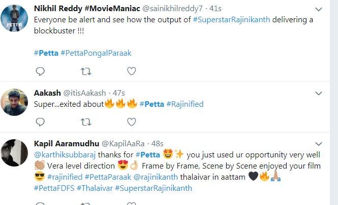रजनीकांत की फिल्म पेटा को लोग देखने के बाद खुश हैं। लोगों का कहना है कि थलाइवा जब भी स्क्रीन के सामने आते हैं, आग लगाते हैं। रजनी के फैन्स का कहना है कि विश्वासम से ज्यादा लोग पेटा को देख रहे हैं।