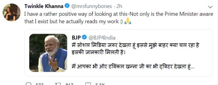 अब प्रधानमंत्री नरेंद्र मोदी की बात के जवाब में ट्विंकल ने लिखा- इस चीज को सकारात्मक तरीके से देखती हूं। प्रधानमंत्री को न केवल मेरी मौजूदगी की जानकारी है, बल्कि मेरे काम को भी पढ़ते हैं।