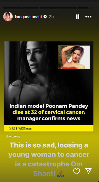 कंगना रनौत ने पूनम पांडे की मौत पर अफसोस जताया है। बता दें कि पूनम पांडे ने आखिरी बार कंगना रनौत द्वारा होस्ट किए गए शो ‘लॉकअप’ में हिस्सा लिया था।