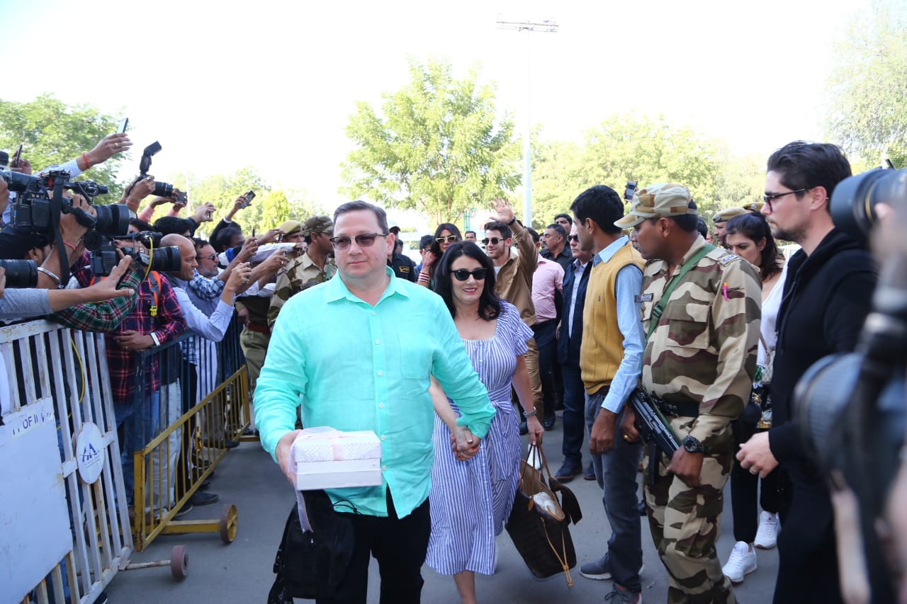 तस्वीरों में देख सकते हैं कि प्रियंका चोपड़ा मीडिया का स्वागत करते हुए नजर आ रही हैं। माथे पर सिंदूर लगाए देसी गर्ल का यह अंदाज और लुक फैन्स को काफी पसंद आ रहा है। प्रियंका और निक की तस्वीरों को देखकर फैन्स बेहद खुश हैं।