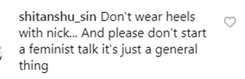 एक यूजर ने लिखा- मां और बाप। वहीं एक अन्य यूजर ने लिखा-आंटी और बेटा। एक सोशल मीडिया यूजर लिखता है- निक के साथ हाई हील मत पहना करो और फेमिनिस्ट बात किया करो। प्रियंका और निक की तस्वीरों पर ज्यादातर निगेटिव कमेंट्स ही आए हैं। 2 घंटे के भीतर कपल की इन तस्वीरों को 10 लाख से भी ज्यादा लाइक्स मिल गए हैं।