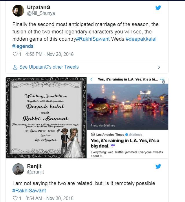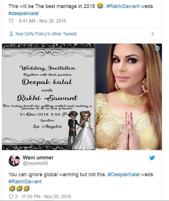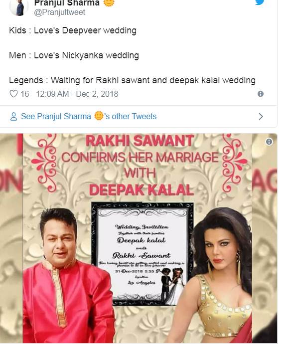 वेडिंग कार्ड के मुताबिक, राखी और दीपक 31 दिसंबर 2018 को लॉस एंजेलिस में सात फेरे लेंगे। यदि आप जानना चाहते हैं कि दीपक कलाल कौन हैं तो आपको बता दें कि दीपक कलाल सोशल मीडिया की एक जानी-मानी सेलिब्रिटी हैं। उनके इंस्टाग्राम पेज पर 68 हजार से ज्यादा फॉलोवर्स हैं। राखी सावंत और दीपक कलाल के वेडिंग कार्ड के शेयर करने के बाद लोग फनी जोक्स और मीम्स बनाकर शेयर कर रहे हैं। कुछ ट्विटर यूजर्स ने दीपिका पादुकोण-रणवीर सिंह और अनुष्का शर्मा-विराट कोहली की शादी की तस्वीर में एडिटिंग कर राखी और दीपक के चेहरों को लगा दिया है।