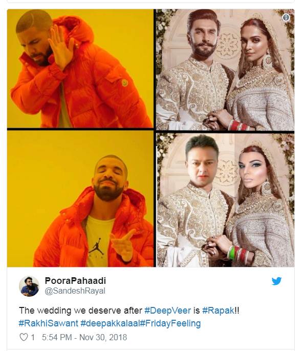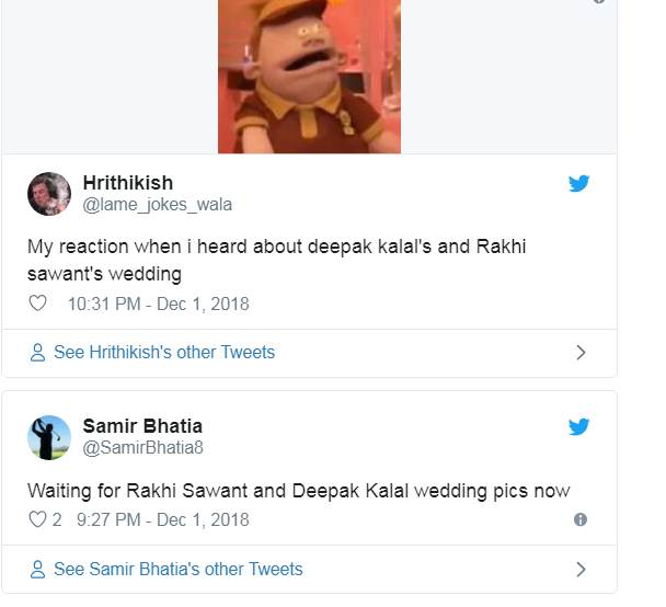 बॉलीवुड में इन दिनों शादी का सीजन चल रहा है। दीपिका पादुकोण-रणवीर सिंह के बाद प्रियंका चोपड़ा और निक जोनस शादी के बंधन में बंध चुके हैं। बॉलीवुड की ड्रामा क्वीन राखी सावंत ने भी अपने फैन्स को सरप्राइज देते हुए दीपक कलाल के संग शादी की घोषणा वेडिंग कार्ड शेयर कर की थी। राखी के शादी का कार्ड सामने आने के बाद लोग उनका जमकर मजाक उड़ा रहे हैं। सोशल मीडिया पर लोग फनी मीम्स बना कर भी शेयर कर रहे हैं।
