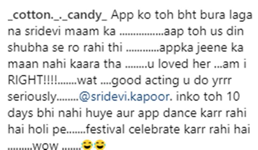 वहीं दूसरे यूजर ने लिखा, ‘आपको तो बहुत बुरा लगा ना श्रीदेवी मैम का, आप तो उस दिन सुबह से रो रही थीं। आपका जीने का मन नहीं कर रहा था, आप उनसे प्यार करती थीं। क्या मैं सही हूं? आप अच्छी एक्टिंग करती हैं। श्रीदेवी को अभी 10 दिन भी नही हुए और आप डांस कर रही हैं होली पर। वाह।’ एक यूजर ने फिरकी लेते हुए कहा कि तुम्हें देख कर ही लोगों को खली बली का मतलब समझ आया है। वहीं राखी के एक फॉलोअर ने लिखा कि ‘मुझे लगा कि तुम अब भी सैड हो।’
