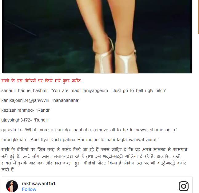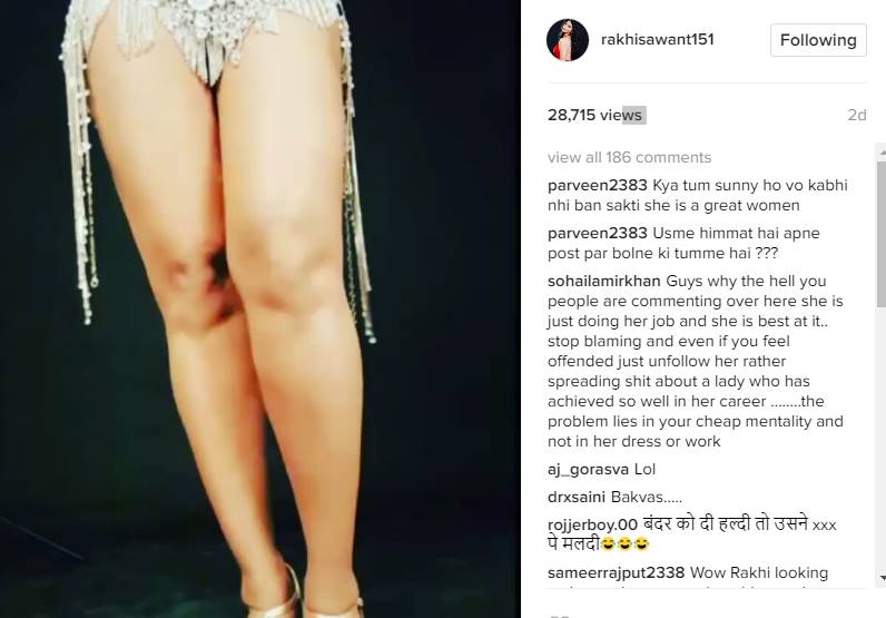 वहीं दूसरे यूजर ने लिखा है कि सनी लियोनी में अपने पोस्ट पर बोलने की हिम्मत है क्या तुममे है। राखी के इस वीडियो पर उनके फैंस काफी भद्दे कमेंट कर रहे हैं। वीडियो में राखी सावंत दिलbर मेरे कब तक मुझे ऐसे ही तड़पाओगे सॉन्ग पर डांस करते दिख रही हैं। इस वीडियो को देखकर अंदाजा लगाया जा सकता है कि इस गाने की शूटिंग उनकी किसी आनेवाली फिल्म के लिए हो। हालांकि अबतक इस फिल्म से जुड़ी कोई भी जानकारी राखी ने इस वीडियो के साथ शेयर नही की है, लेकिन इस वीडियो ने सोशल मीडिया पर उन्हें चर्चा में ला दिया है। गौरतलब है कि राखी सावंत एक अच्छी डांसर हैं, लिहाजा उन्होंने कई आइटम सॉन्ग्स पर धमाकेदार परफोर्मेंस दिया है। लेकिन इस बार उन्होंने अपना डांस वीडियो सोशल मीडिया पर शेयर किया है।