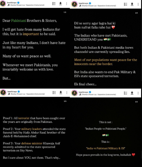 अपने पोस्ट में रणवीर ने आगे लिखा, “दिल से सॉरी अगर लग रहा है कि हम नफरत फैला रहे हैं। पाकिस्तानी लोगों से मिलने वाले भारतीय आपकी बात समझते हैं। हमारी ज्यादातर आबादी सीमा के नजदीक मासूमों के लिए शांति चाहती है, लेकिन भारत भी पाक सेना और आईएसआई के स्टेट स्पॉन्सर्ड आतंकवाद को खत्म करना चाहती है।”
