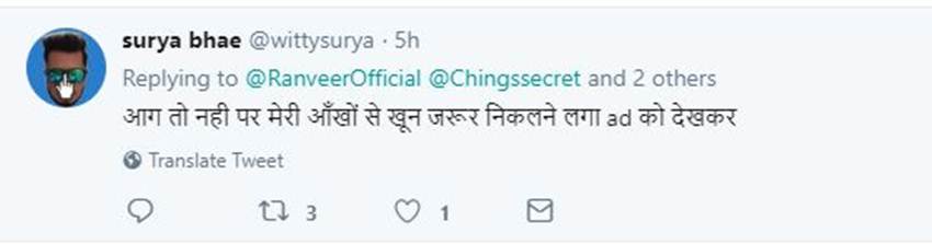 एक यूजर ने कमेंट बॉक्स में लिखा- मुझे भी यह चटनी खानी है। एक अन्य यूजर ने लिखा- भाई क्या है। कितना खराब सेंस ऑफ ह्यूमर है और पैसों के लिए कितना मूर्ख बना रहे हो। वहीं एक यूजर लिखता है- आग तो नहीं लगी लेकिन आंखों से खून जरूर निकलने लगा ऐड देखकर। एक इंस्टाग्रान हैंडल ने लिखा- रणवीर सिंह यह सब क्या है। रणवीर सिंह द्वारा एक दिन पहले शेयर किए वीडियो को 30 लाख से ज्यादा व्यूज मिल चुके हैं। जबकि कमेंट्स की संख्या हजारों में है। हालांकि रणवीर की पोस्ट में ज्यादातर निगेटिव कमेंट्स ही हैं।