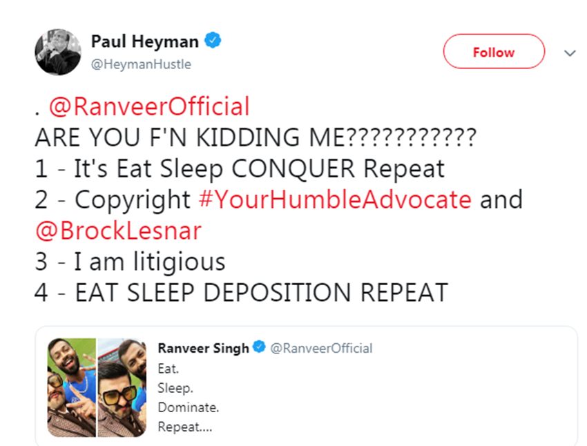 ब्रॉक लेसनर के वकील पॉल हेमैन ने ट्वीट में लिखा- रणवीर सिंह क्या तुम मेरे साथ मजाक कर रहे हो? 1. 1 – It’s Eat Sleep CONQUER Repeat 2. कॉपीराइट #आपका तुम्हारा शालीन वकील और ब्रॉक लेसनर, 3 – I am litigious 4 – EAT SLEEP DEPOSITION REPEAT.