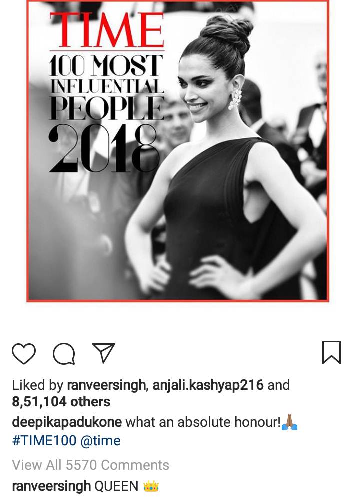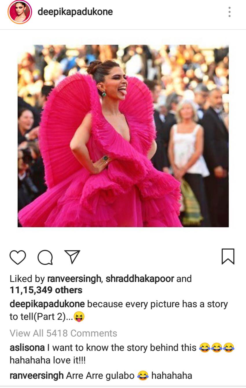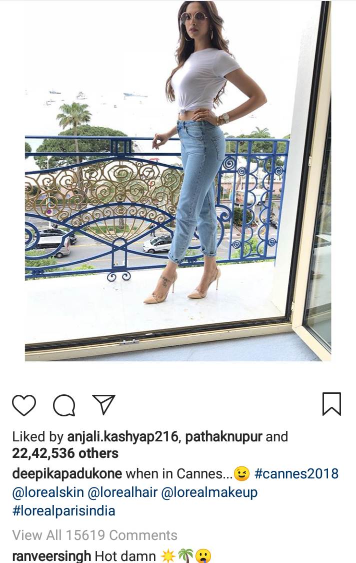 दीपिका के लिए रणवीर के प्यार देखकर फैन्स उत्साहित हो गए और दोनों से जल्द शादी करने की बात कहने लगे। जबकि कुछ लोगों ने दोनों को बेस्ट कपल बताया। हालांकि यह पहला मौका नहीं है जब दीपिका की तस्वीर पर रणवीर सिंह ने रिएक्शन देकर प्यार जताया है, इसके पहले भी कई मौकों पर वह सोशल मीडिया पर प्यार का इजहार कर चुके हैं। दीपिका की तस्वीरों पर क्वीन, हेल्लो सनसाइन और उफ्फ यार समेत कई कमेंट्स कर चुके हैं। जबकि कुछ दिनों पहले ही रणवीर सिंह ने एक थ्रो-बैक तस्वीर को शेयर किया था। दीपिका ने फोटो के कमेंट बॉक्स में लिखा था- नो।