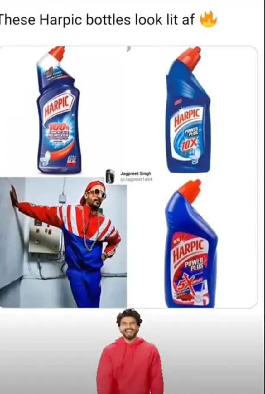 गली बॉय एक्टर ने अपने इंस्टाग्राम स्टोरी पर एक तस्वीर शेयर की। जिसमें वह ब्लू, रेड और व्हाइट कलर का ट्रैक सूट पहने हुए नजर आ रहे हैं। अपने इस अवतार की रणवीर ने टॉयलेट क्लीनर बोतल से तुलना की है। फोटो के साथ तस्वीर ने लिखा- ‘These Harpic bottels look lit af.’
