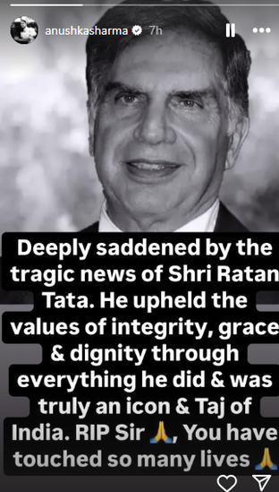 बॉलीवुड एक्ट्रेस अनुष्का शर्मा ने अपने सोशल मीडिया हैंडल इंस्टाग्राम पर स्टोरी शेयर की है, जिसमें उन्होंने रतन टाटा की फोटो शेयर करते हुए लिखा कि रतन टाटा के निधन की खबर सुनकर बहुत दुख हुआ। उन्होंने अपने हर काम में ईमानदारी, शालीनता और गरिमा के मूल्यों को बनाए रखा और वे वास्तव में भारत के प्रतीक और ताज थे। RIP सर ए, आपने कई जिंदगियों को प्रभावित किया है।