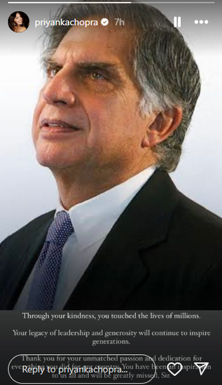 वहीं, प्रियंका चोपड़ा ने भी रतन टाटा को श्रद्धांजलि देते हुए लिखा कि अपनी दयालुता से आपने लाखों लोगों के जीवन को प्रभावित किया। आपके नेतृत्व और उदारता की विरासत पीढ़ियों को प्रेरित करती रहेगी। हमारे देश के लिए आपने जो कुछ भी किया, उसके लिए आपके बेजोड़ जुनून और समर्पण के लिए धन्यवाद। आप हम सभी के लिए प्रेरणा रहे हैं और हमें आपकी बहुत याद आएगी, सर।