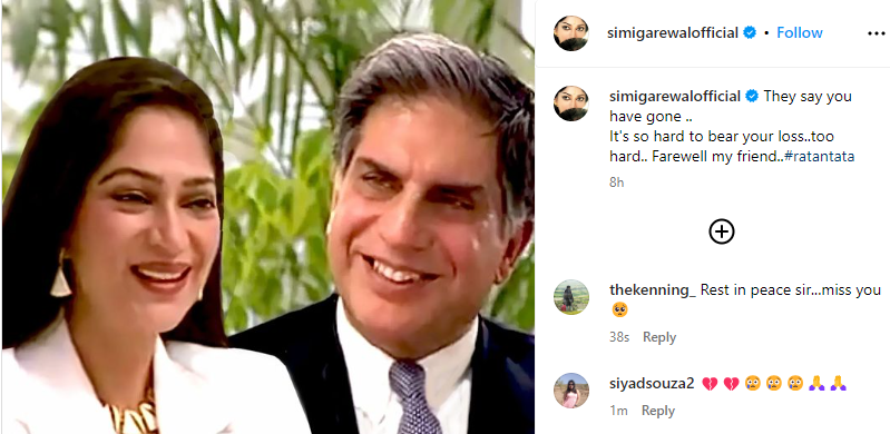 सिमी गरेवाल ने जो तस्वीर शेयर की है वो उनके शो ‘रेंडेज़वस विद सिमी गरेवाल’ की है। तस्वीर के साथ सिमी ने लिखा, “वो कह रहे हैं तुम चले गए। तुम्हारे जाने का गम बर्दाश्त करना बहुत मुश्किल है। अलविदा मेरे दोस्त।” सिमी गरेवाल की इस पोस्ट पर लोगों ने ढेर सारे कमेंट्स कर रतन टाटा को श्रद्धांजलि दी है। एक यूजर ने लिखा, “सुबह रतन टाटा के निधन की खबर सुनकर मुझे आपका इंटरव्यू ही याद आया।”