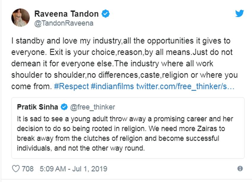 रवीना की पोस्ट पर तमाम सोशल मीडिया यूजर्स अपना रिएक्शन जाहिर कर रहे हैं। एक यूजर ने लिखा- जायरा वसीम ने कहा कि काम के कारण उनके और अल्लाह के बीच का रिश्ता टूट रहा है। सही है। इसके बाद अब उन्हें पैसा और अवॉर्ड भी वापस कर देना चाहिए जो उन्हें फिल्म इंडस्ट्री से मिले हैं।